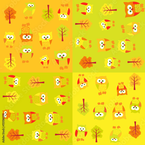 Seamless pattern with owls and trees in squares
