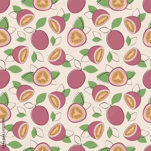 Seamless pattern with passion fruit in flat cartoon design. Passion fruit in boho style for fabric, cards, wallpaper.Vector illustration.