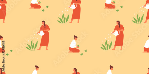 Seamless pattern with people gardening. Women work in garden caring for plants. Flat vector illustration.
