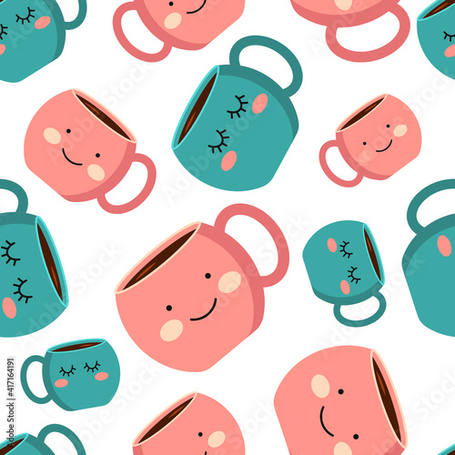 Seamless pattern with pink and blue cup with emotions, smile. Coffee cup with smoke float up. Vector Illustration. Flat style. Decorative design for cafeteria, posters, banners, cards