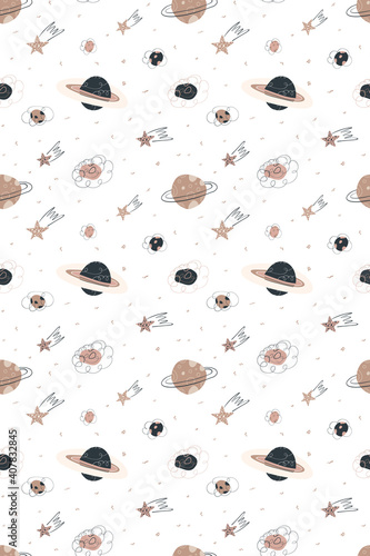 Seamless pattern with planets and stars in pastel colours. Great for kids nursery, wallpaper, textile and apparel.
