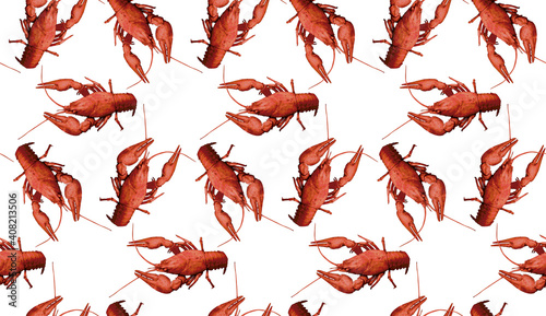 Seamless pattern with red crayfish on white background. Endless crawfish texture. Raster illustration.