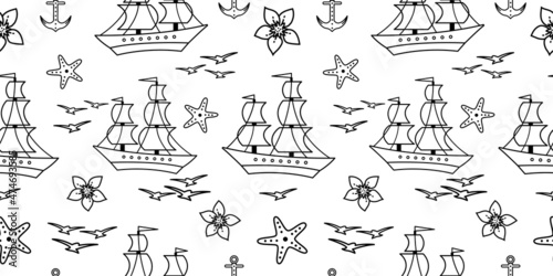 Seamless pattern with sailship, anchor, and flowers. Cute Marine pattern for fabric, baby clothes, background, textile, wrapping paper, and other decoration. Vector illustration. black and white.