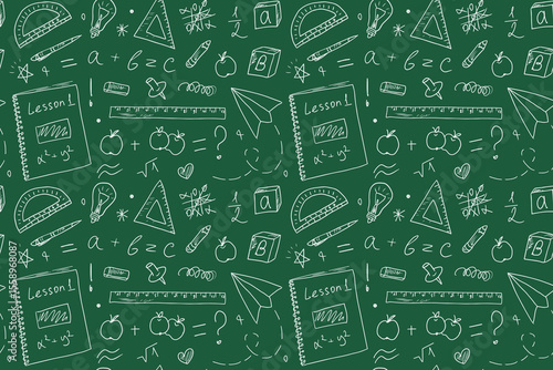 Seamless pattern with school drawings on a blackboard background. Background for school textbook covers, textiles, and stationery, Back to School concept. Sloppy sketches in a notebook