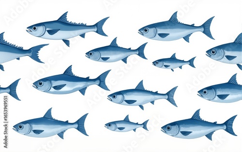 Seamless Pattern with Shoal of Fishes on isolated background. Hand drawn watercolor illustration with wavy line. Sea Border for banner or ornament in blue colors. Undersea drawing for backdrop.