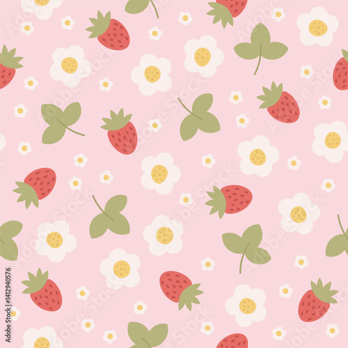 Seamless pattern with strawberries, flowers and leaves on pink background.