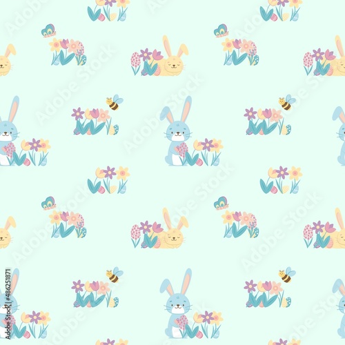 Seamless pattern with sweet and cute blue bunny rabbits, spring flowers, colorful eggs, butterfly and bee on blue background in cartoon flat style. Vector children illustration.