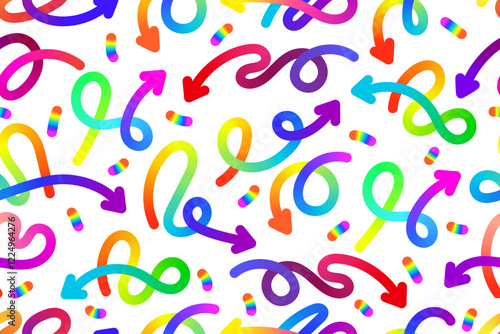 Seamless pattern with swirling arrows and lines. Rainbow color abstraction. Bright colorful elements on a white background. Festive confetti. Winding, curved, wavy shapes. Vector illustration.