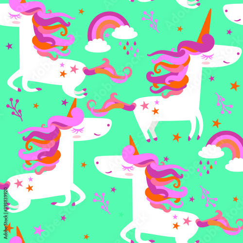 Seamless pattern with unicorns, clouds and rainbow, vector illustration