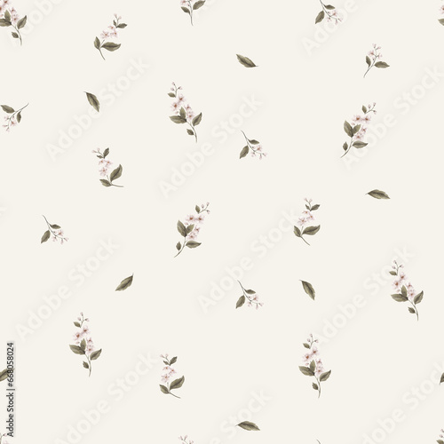 Seamless pattern with watercolor vintage flowers and leaves, isolated on colored background