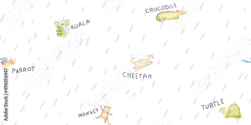 seamless pattern with wild animals and animal names, cute watercolor illustration isolated on white background