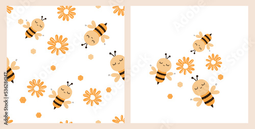 Seamless pattern with yellow flower, bee cartoons and honey symbol on white background. Cute bee cartoons and hand drawn flower isolated on white background vector.