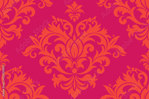 Seamless pink floral damask pattern with vintage flower, leaf, and swirl ornament illustration for textile, wallpaper, and decoration