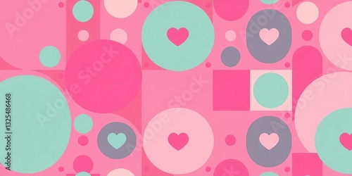 Seamless pink retro geometric pattern with circles, squares, & hearts Ideal for cards, invitations, illustration, mother's day