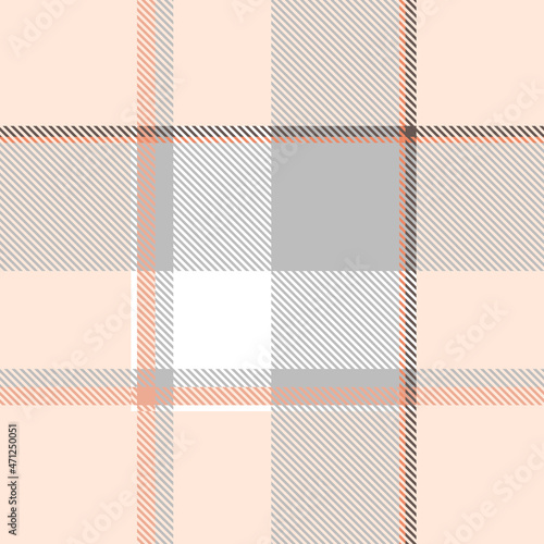 Seamless plaid pattern in pale coral, pastel gray and white.