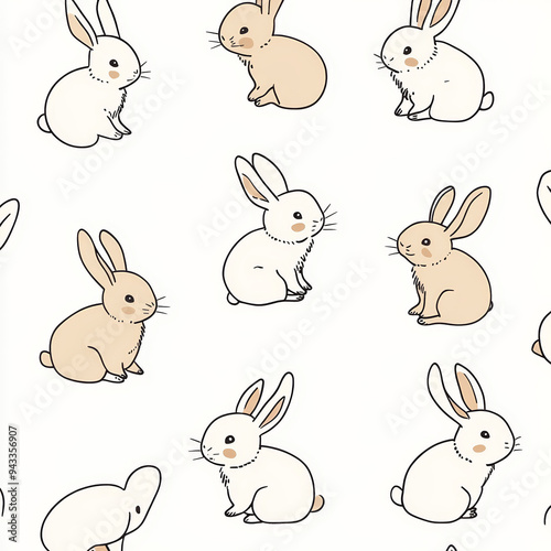 Seamless, Rabbit pattern, Hand-drawn rabbits, Pastel colors, Minimalist design, Cute rabbits, Soft colors, Simple drawing, White background, Negative space, Decorative design, Vector pattern, Nature i