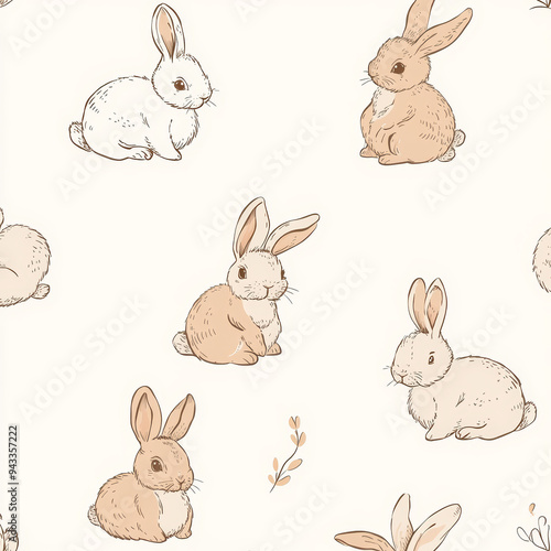 Seamless, Rabbit pattern, Hand-drawn rabbits, Pastel colors, Minimalist design, Cute rabbits, Soft colors, Simple drawing, White background, Negative space, Decorative design, Vector pattern, Nature i
