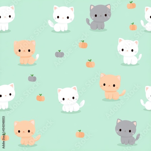 Seamless repeat pattern of tiny ghost kittens with Halloween-themed colors (milky white, peach orange, soft gray) on mint green background