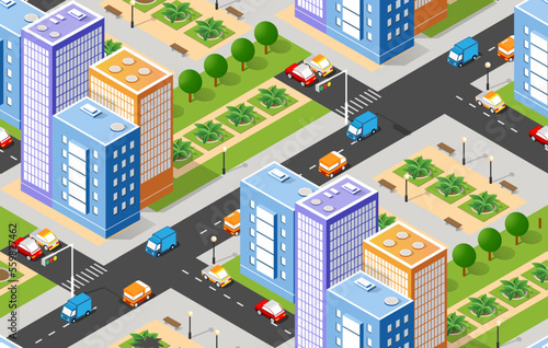 Seamless repeating pattern city isometric architecture business