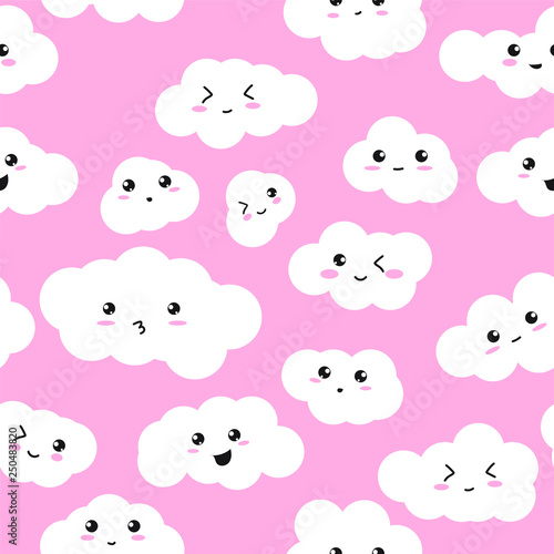 Seamless Repeating Vector Pattern Kawaii Clouds on Pink Background
