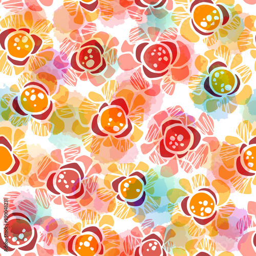 Seamless rich pattern with abstract flowers and scribbles on watercolor background