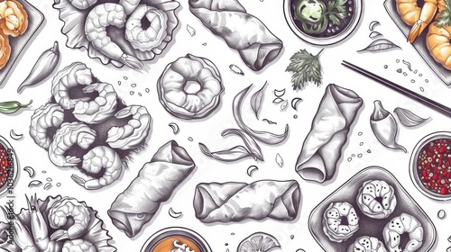 Seamless rough pattern featuring detailed sketches of Thai appetizers like shrimp cakes, crispy pork belly, and fried spring rolls. Vector isolated on white background for restaurant banners