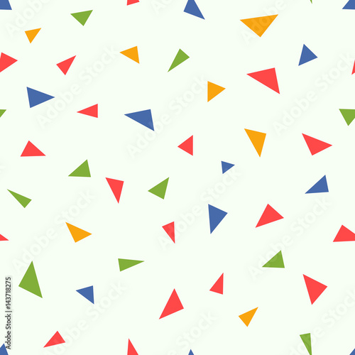 Seamless simple geometric pattern with small colorful triangle forms. Repeat blue, red, green, yellow color figures. Vector texture background.