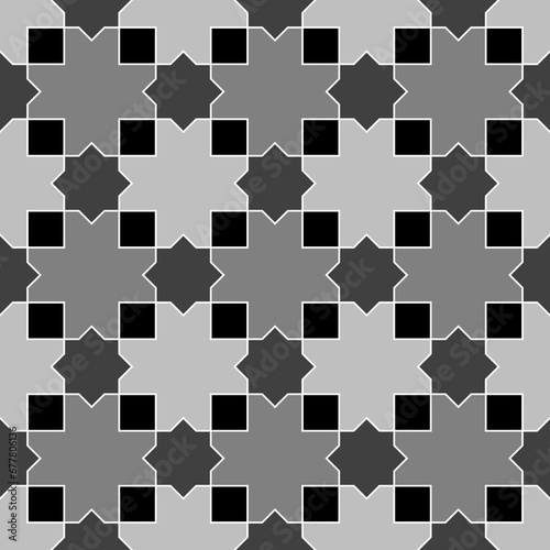 Seamless surface pattern design with Moroccan stars and crosses tiles ornament. Oriental traditional ornamentation with repeated geometric shapes. Ancient mosaic wallpaper. Ethnic motif. Digital paper