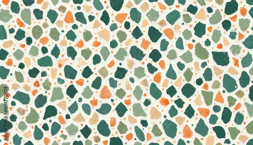 Seamless terrazzo pattern featuring green, orange, and beige chips on white background. This texture offers vintage yet modern feel, suitable for interior design, fashion, or digital art backgrounds.
