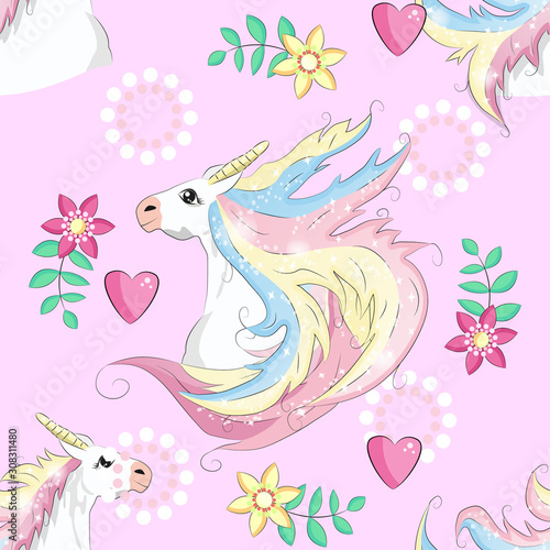 Seamless unicorn pattern. Magic background with cute unicorns, clouds and stars.