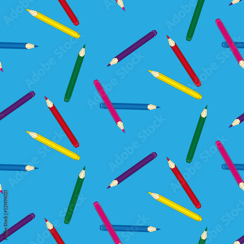 Seamless vector blue background with colorful pencils for school