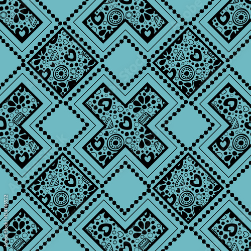 Seamless vector decorative hand drawn pattern. Ethnic endless background with ornamental decorative elements with traditional motives, tribal geometric figures, dots and flowers.