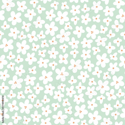 Seamless vector floral pattern with tiny white blossoms on soft mint green background. Minimal hand-drawn illustration perfect for spring textiles, baby clothing, gift wrap and modern home decor desig