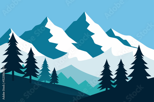 Seamless vector illustration of a winter forest mountain landscape with snow-covered fir trees under a cold sky, perfect for holiday and Christmas designs