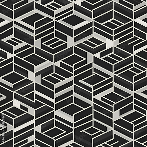 Seamless vector pattern featuring complex isometric geometric shapes in a modern black and white color palette. Abstract graphic resource for wallpapers textiles packaging and digital backgrounds
