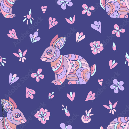 Seamless vector pattern of rabbits and flowers. Suitable for packaging, fabrics, wallpapers and simple colorings. Easter background.