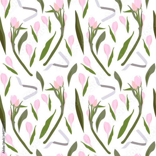 Seamless vector pattern pink tulips with buds, leaves, ribbons on a white background