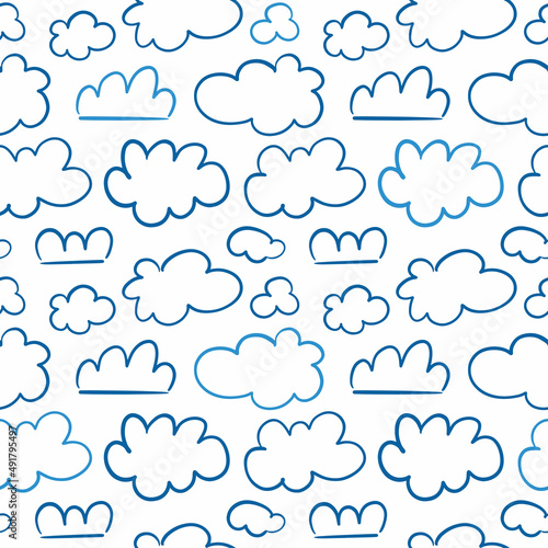 Seamless vector pattern with blue cloud doodles on white background. Modern design for fabric and paper, surface textures.