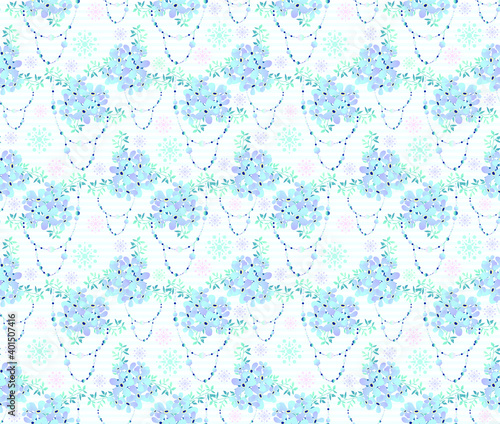 Seamless vector pattern with bouquets of blue forget-me-not flowers, decorative beads and patterned stars on the background. Delicate vintage texture for fabrics and scrapbooking
