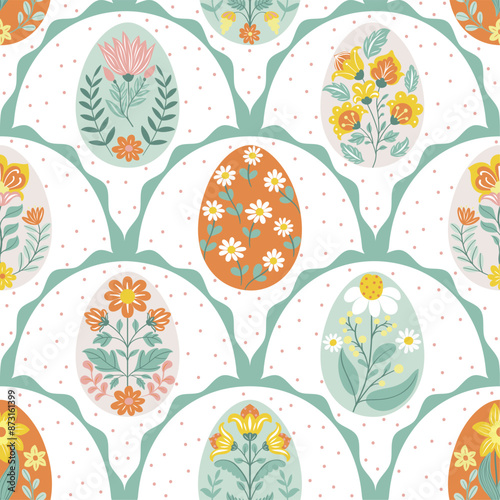 Seamless vector pattern with Easter eggs in folk style. Ideal for printing on fabric, wrapping paper, greeting cards, and holiday home decor.