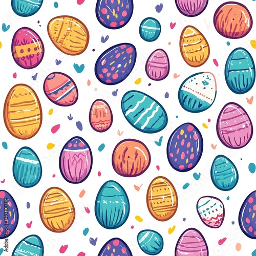 Seamless vector pattern with hand-drawn Easter eggs, Cute doodle design for print, textile, wallpaper, packaging, web posters. Flat-style illustration, perfect for festive Easter-themed projects.
