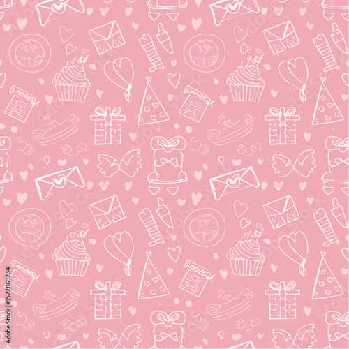 Seamless vector pattern with romantic doodle drawings in line art style. Coquette pink background for valentine's day, wedding, dating event. Cute texture with outline whimsical ...