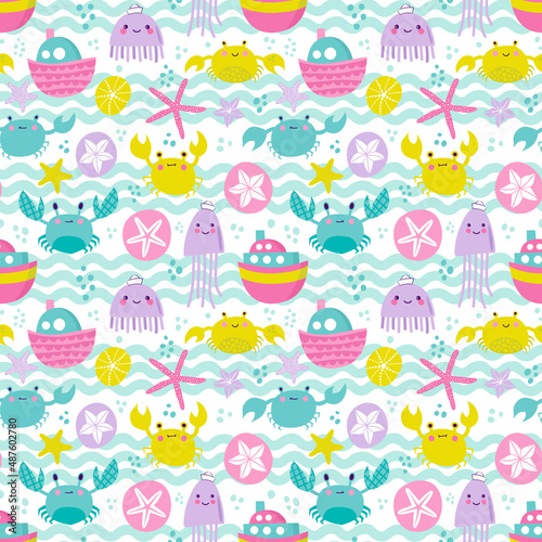 Seamless vector pattern with sea boats,crabs and jellyfish. Childish background.