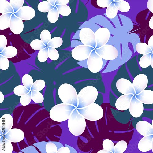 Seamless vector tropical pattern. Plumeria, frangipani. Exotic vector beach wallpaper seamless pattern.