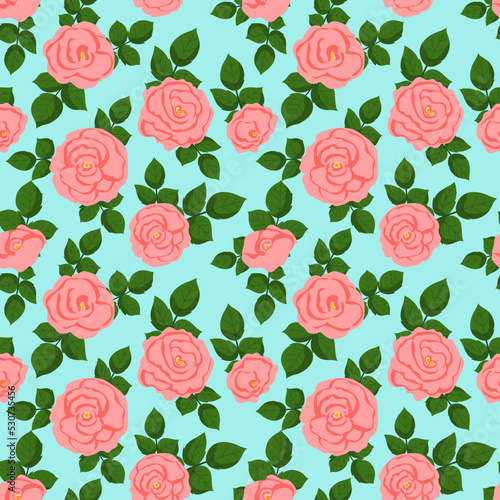 Seamless vintage floral pattern with red pink on a turquoise background. Backdrop for wallpaper, print, textile, fabric, wrapping. Vector illustration