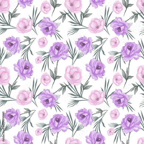 Seamless watercolor floral pattern - pink and purple roses composition on white background, perfect for wrappers, wallpapers, postcards, greeting cards, wedding invitations, romantic events.