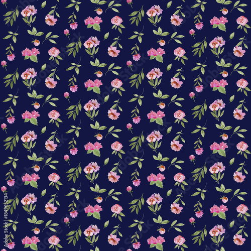 Seamless watercolor floral pattern with pink flowers on navy background