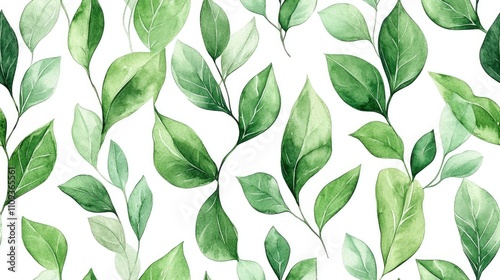 Seamless watercolor pattern of green leaves and branches on a white background ideal for wedding invitations and greeting cards