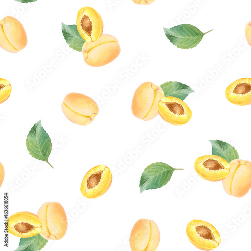 Seamless watercolor pattern with hand drawn apricot with leaves and half apricot.