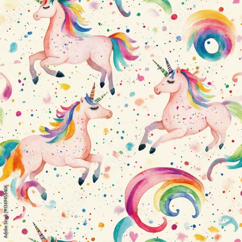 Seamless Watercolor Patterns Unicorn Rainbow (Cute Style) Watercolor Unicorns with Rainbows and Confetti Pattern